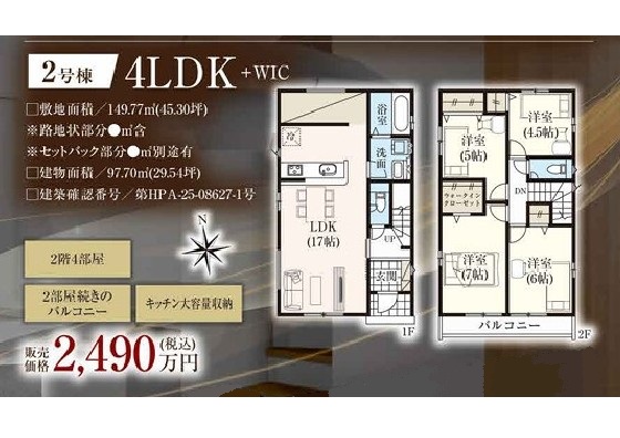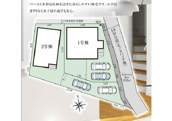 | 備考 | 全2棟 <1号棟> 敷地141.31㎡(約42.7坪)建物100.19㎡(約30.3坪)2,790万円 4LDK+WIC×3+パントリー <2号棟> 敷地149.77㎡(約45.3坪)建物97.70㎡(約29.5坪)2,490万円 4LDK+WIC ----------------------------------------------------------------------------------------- その他法令上の制限:文化財保護法(埋蔵文化財)、都市再生特別措置法、農地法、景観法 電波障害等によるケーブルTV、共聴アンテナの申込は買主様負担となります。 電気供給の為、敷地内に電柱及び支線が入る場合があります。 所有権移転登記手続きにおいて売主指定の司法書士・土地家屋調査士を利用して頂きます。 TVアンテナ、網戸、照明器具、カーテンレール、面格子は付きません。 網戸一式別途154,000円(税込) 表題登記別途93,500円(税込) フラット35ご利用の場合における各証明書取得代金が別途必要になります。 | ||