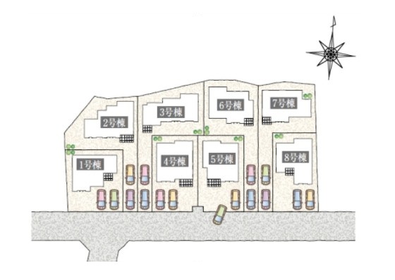 | 備考 | <2号棟> 180.28㎡(54.53 坪)102.26㎡(30.93坪)4LK 3,200万円 --------------------------------------------------------------------------------------- <3号棟> 179.66㎡(54.35 坪)102.26㎡(30.93坪)4LK 3,200万円 --------------------------------------------------------------------------------------- <4号棟> 148.91㎡(45.05 坪)101.02㎡(30.56坪)4LK 3,380万円 --------------------------------------------------------------------------------------- <5号棟> 149.10㎡(45.10 坪)102.26㎡(30.93坪)4LK 3,380万円 --------------------------------------------------------------------------------------- <6号棟> 174.02㎡(52.64 坪)101.02㎡(30.56坪)4LK 3,200万円 --------------------------------------------------------------------------------------- <7号棟> 170.79㎡(51.66 坪)102.67㎡(31.06坪)4LK 3,200万円 --------------------------------------------------------------------------------------- <8号棟> 150.25m²(45.45 坪)102.67㎡(31.06坪)4LK 3,380万円 --------------------------------------------------------------------------------------- | ||