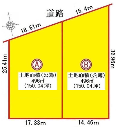 土地権利所有権道路北側幅員2.75m公道に【A】18.61m接道、【B】15.40m接道