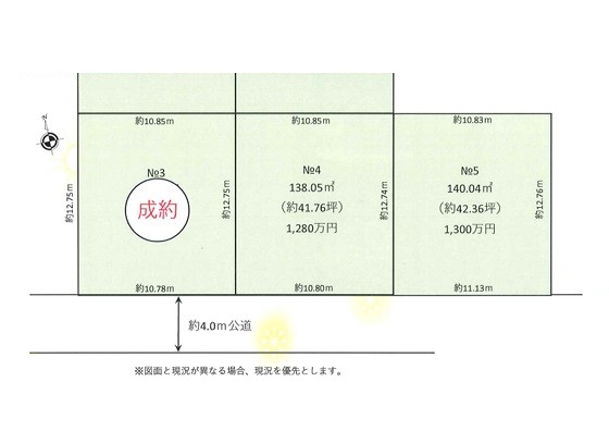 | 備考 | 2区画 <№4> 敷地138.05㎡(約41.76坪)1,280万円 <№5> 敷地140.04㎡(約42.36坪)1,300万円 ----------------------------------------------------------------------------------------- その他法令上の制限:宅地造成等規制法、対高さ10m 埋蔵文化財包蔵地 敷地内に電柱・支線等が入る場合があります | ||