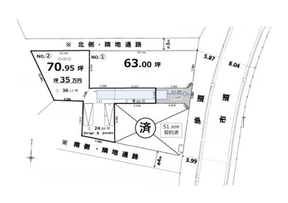 | 備考 | その他法令上の制限:都計法29条許可 ----------------------------------------------------------------------------------------- <区画①> 208.28㎡(63.0坪)3,150万円 東側幅員約13.9m公道/北側幅員約2.7m通路敷 <区画②> 264.6㎡(80.0坪)2,480万円 東側幅員約13.9m公道/北側幅員約2.7m通路敷/南側幅員約4.0m通路敷 ----------------------------------------------------------------------------------------- | ||