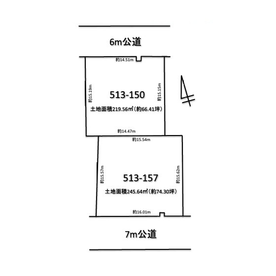 | 土地権利 | 所有権 | 道路 | 北側幅員6.0m公道に間口14.5m接面 南側幅員7.0m公道に間口16.0m接面 |